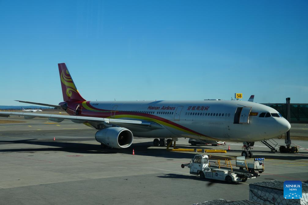 Dieses Foto vom 22. M?rz 2025 zeigt ein Flugzeug von Hainan Airlines auf dem internationalen Flughafen Oslo Gardermoen im Bezirk Akershus, Norwegen. Die chinesische Fluggesellschaft Hainan Airlines hat am Samstag offiziell eine Direktverbindung zwischen Beijing und Oslo er?ffnet und damit die Flugverbindungen zwischen China und Nordeuropa weiter ausgebaut. (Bai Yun/Xinhua)