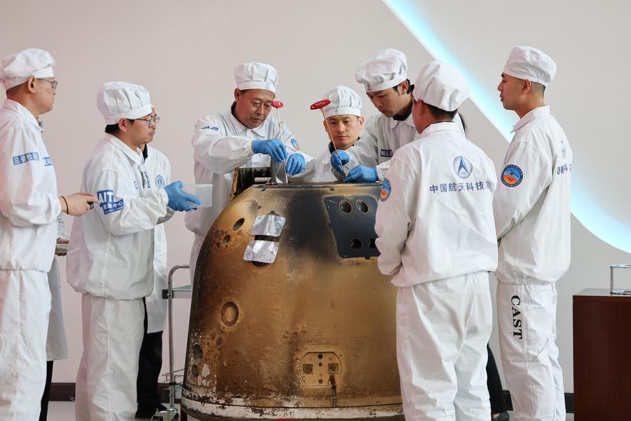 Der Rückholer der Mondsonde Chang'e-6 wird w?hrend einer Zeremonie in der China Academy of Space Technology der China Aerospace Science and Technology Corporation in Beijing am 26. Juni 2024 ge?ffnet. (Foto: Xinhua/Jin Liwang)