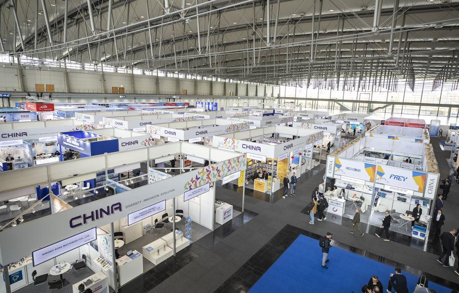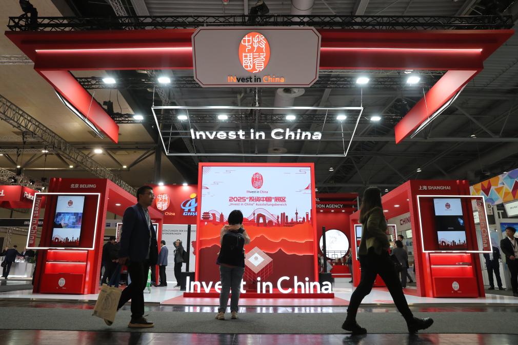 Dieses Foto, aufgenommen am 31. M?rz 2025, zeigt den Stand von ?Invest in China“ auf der Hannover Messe 2025 in Hannover, Deutschland. (Xinhua/Du Zheyu)