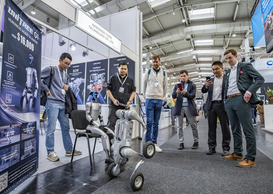 Besucher beobachten einen Roboter am Stand von Unitree auf der Hannover Messe 2025 in Hannover, Deutschland, am 1. April 2025. (Xinhua/Zhang Fan)