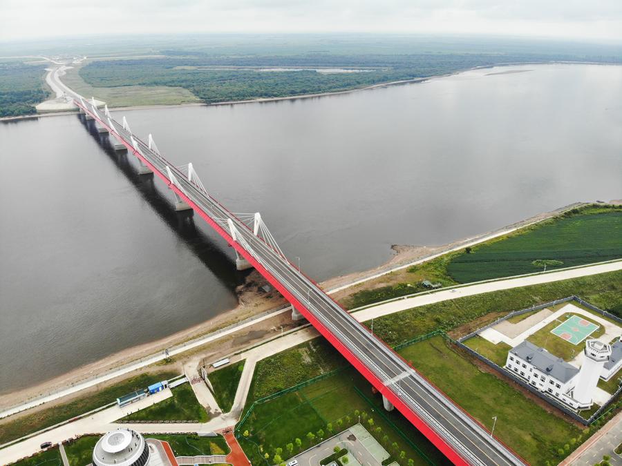 Ein Luftbild einer Drohne vom 11. August 2023 zeigt die grenzüberschreitende Autobahnbrücke Heihe-Blagoweschtschensk von der Stadt Heihe in der nordostchinesischen Provinz Heilongjiang aus gesehen. (Xinhua/Wang Song)