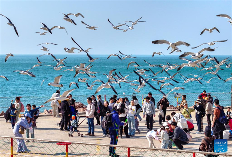 Touristen interagieren am 6. April 2025 an der Küste in einem Wildpark in der N?he des Dorfes Xixiakou in der Stadt Rongcheng in der ostchinesischen Provinz Shandong mit Lachm?wen. (Foto: Li Xinjun/Xinhua)