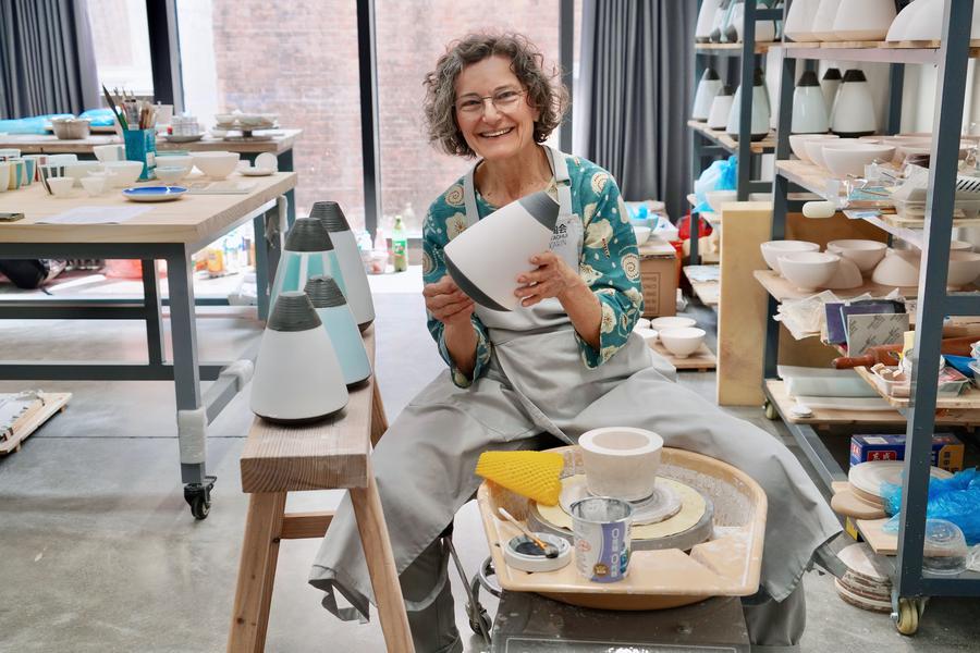 Die deutsche Keramikkünstlerin Karin Flurer-Brünger zeigt Kunstwerke in ihrem Studio in der Taoxichuan Ceramic Art Avenue in Jingdezhen in der ostchinesischen Provinz Jiangxi. 8. April 2025. (Foto: Xinhua/Du Juanjuan)