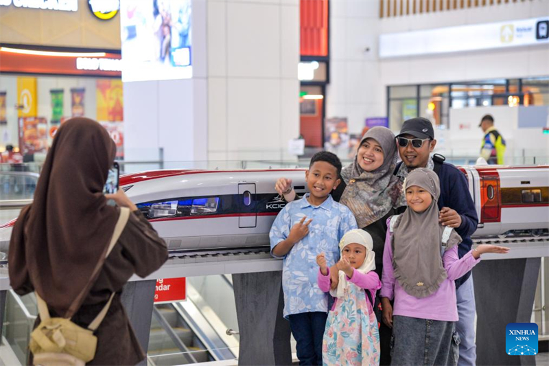 Fahrg?ste posieren für Fotos mit einem Modell eines elektrischen Hochgeschwindigkeitszuges der Hochgeschwindigkeitsbahn Jakarta-Bandung in der Wartehalle des Bahnhofs Halim in Jakarta, Indonesien, 28. April 2025. (Xinhua/Xu Qin)