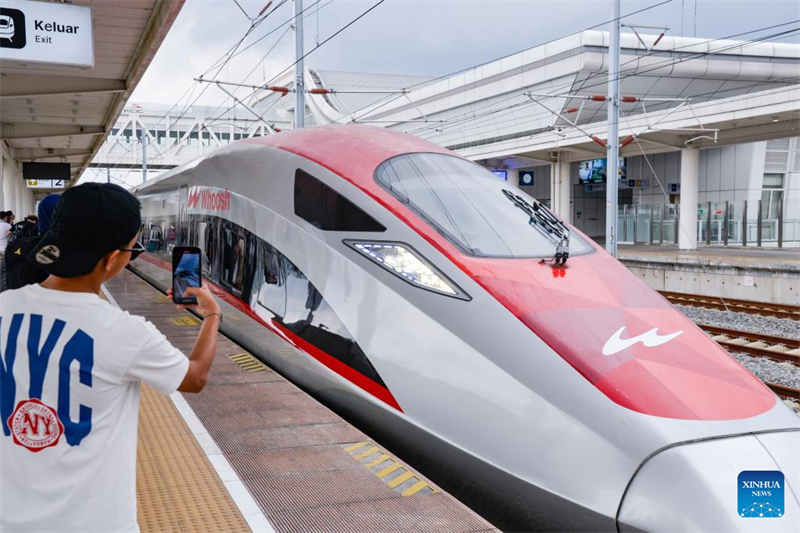 Ein Fahrgast filmt einen einfahrenden elektrischen Hochgeschwindigkeitszug am Bahnhof Padalarang, Indonesien, 24. April 2025. (Xinhua/Xu Qin)