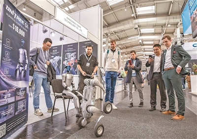 Am 1. April sehen Besucher sich auf der Hannover Messe in Deutschland eine Vorführung von Roboterhunden am Stand des chinesischen Unternehmens Unitree Robotics an. (Foto: Xinhua/Zhang Fan)