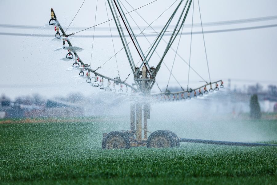 Eine Bew?sserungsmaschine bei der wassersparenden Bew?sserung in einer Genossenschaft in der Stadt Shijiazhuang in der nordchinesischen Provinz Hebei am 14. M?rz 2025. (Foto: Zhang Xiaofeng/Xinhua)
