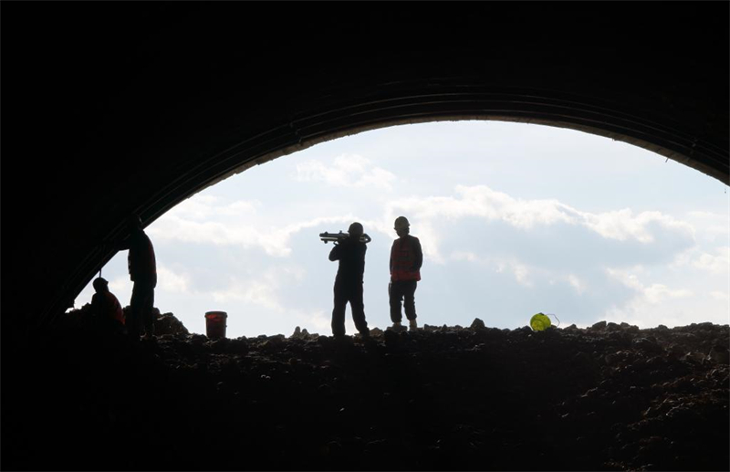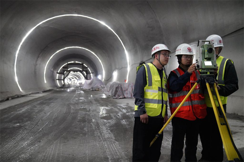 Mitarbeiter arbeiten auf der Baustelle eines Tunnels entlang der Bahnstrecke zwischen Suifenhe und der chinesischen Grenze zu Russland in Suifenhe, Provinz Heilongjiang im Nordosten Chinas, 27. Mai 2025. (Xinhua/Wang Song)