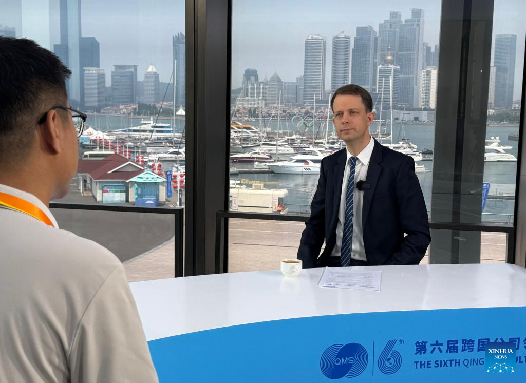 Dieses Foto zeigt Kurt Van Rysselberge, Leiter von Bekaert China, bei einem Interview mit Xinhua w?hrend des 6. Qingdao Multinationals Summit in Qingdao in der ostchinesischen Provinz Shandong, 18. Juni 2025. (Xinhua/Wu Feizuo)