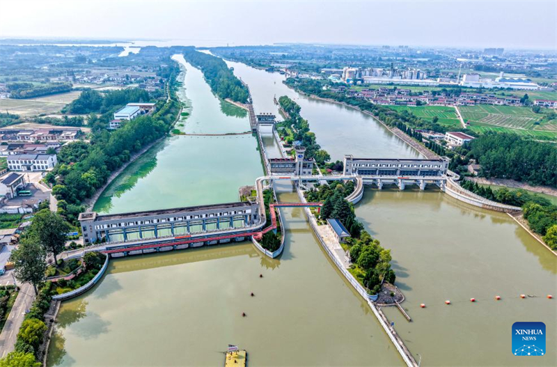 Ein Drohnenfoto vom 6. Juli 2025 zeigt die Schleusen der ersten Projektphase der ?stlichen Route des Süd-Nord-Wasserumleitungsprojekts in Yangzhou in der ostchinesischen Provinz Jiangsu. (Ren Fei/Xinhua)
