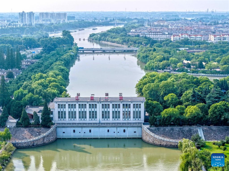 Ein Drohnenfoto vom 6. Juli 2025 zeigt eine Kontrollstation des Jiangdu-Wasserkontrollprojekts am Ursprung der ?stlichen Route des Süd-Nord-Wasserumleitungsprojekts in Yangzhou in der ostchinesischen Provinz Jiangsu. (Ren Fei/Xinhua)