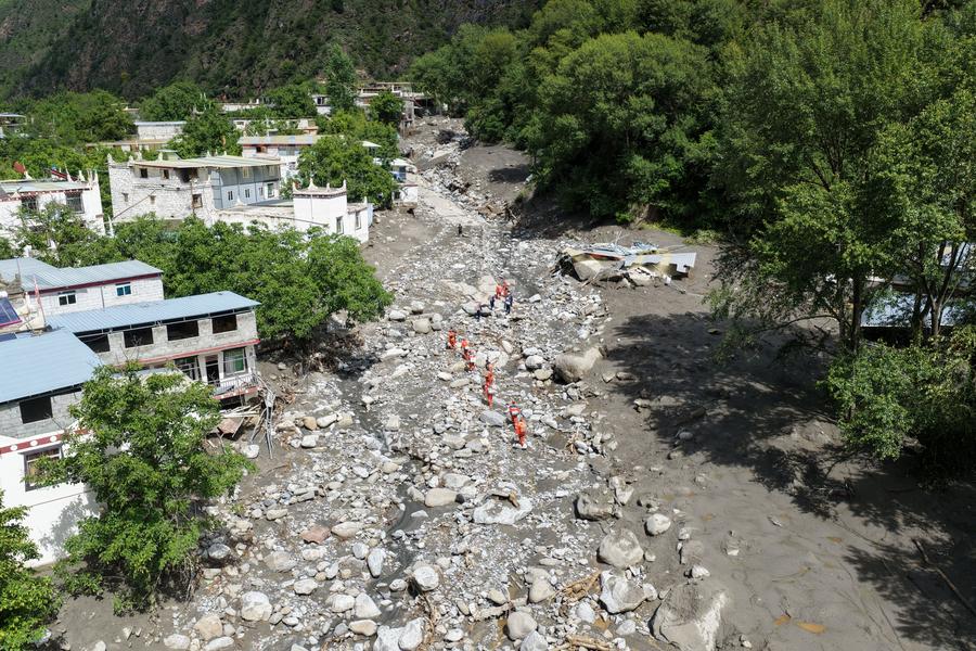 Rettungskr?fte suchen am 5. Juli 2025 nach überlebenden eines Erdrutsches im Kreis Rongchag im tibetischen autonomen Bezirk Garze in der südwestchinesischen Provinz Sichuan. (Foto: Xinhua)