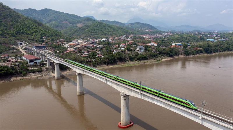 Ein Personenzug f?hrt am 28. Mai 2023 über eine Brücke der China-Laos-Bahn in Luang Prabang, Laos. (Chen Chang/Xinhua)