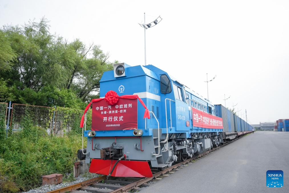 Dieses Foto vom 25. August 2025 zeigt einen China-Europa-Güterzug, beladen mit hochwertigen Autoteilen des führenden chinesischen Automobilherstellers China FAW Group Co., Ltd. in Changchun, Provinz Jilin, Nordostchina. (Xinhua)
